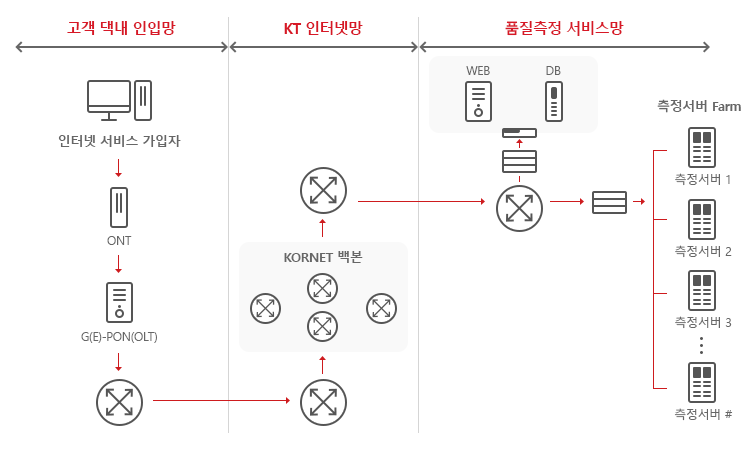 측정구간은 고객 PC 에서 코넷(Kornet) 백본망에 위치한 측정서버까지 입니다. 다운로드/업로드 속도측정은 TCP 소켓 연결방식으로 측정을 진행하며 디스크 액세스를 최소화하는 방법으로 측정을 진행합니다. 또한 물리적인 링크 속도에 최대한 근접하는 업로드 속도 및 다운로드 속도를 측정하기 위하여 윈도우 사이즈 및 버퍼사이즈를 유동적으로 변경시키는 AMM(Adaptive Measurement Method) 방식을 사용합니다.